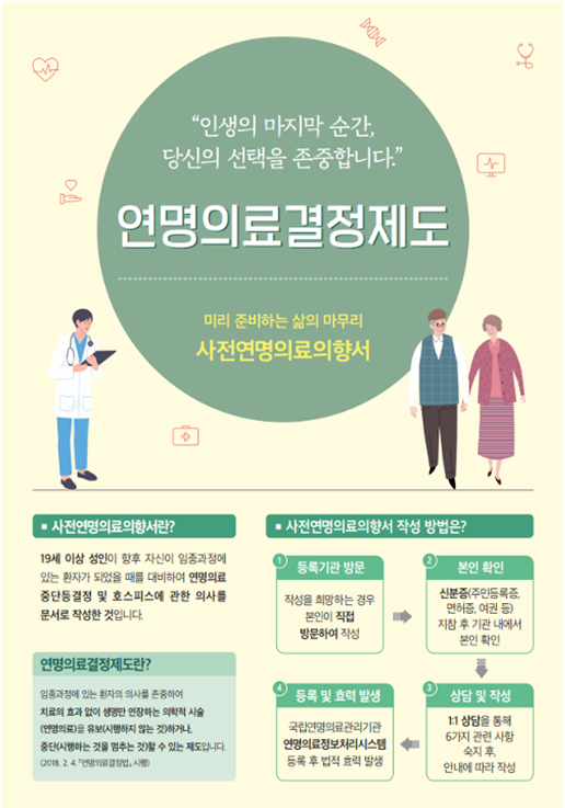 19세 이상의 사람은 누구나 자신이 향후 임종과정에 있는 환자가 되었을 때를 대비하여 연명의료 및 호스피스에 관한 의향을 문서로 작성해 둘 수 있습니다.