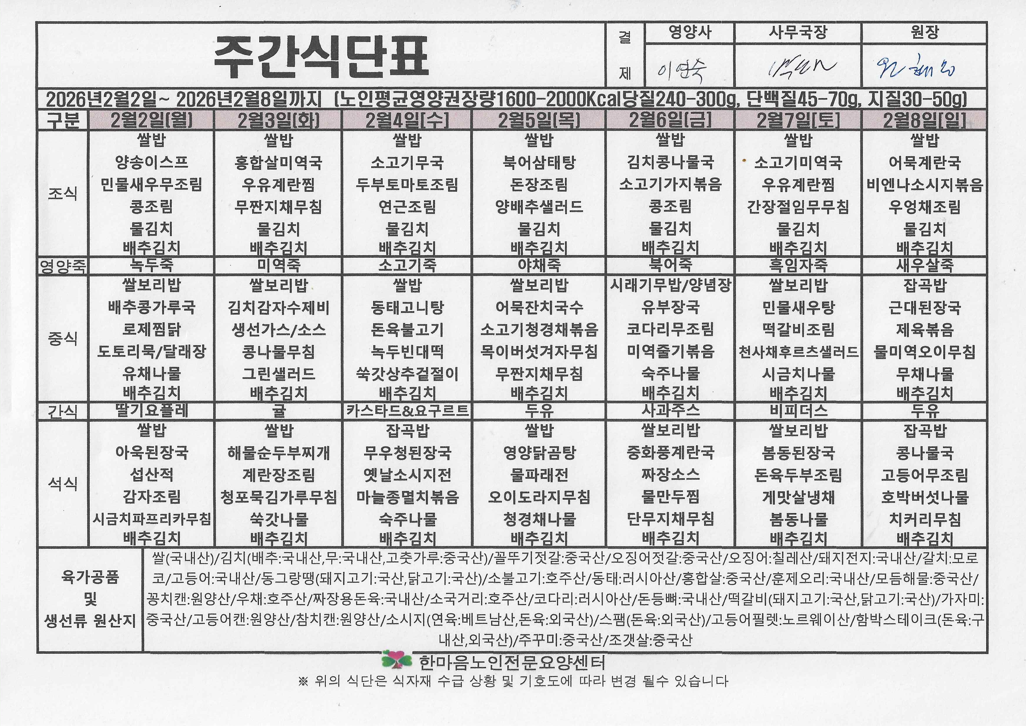 2월 1주 식단표(02.02.~02.08.)