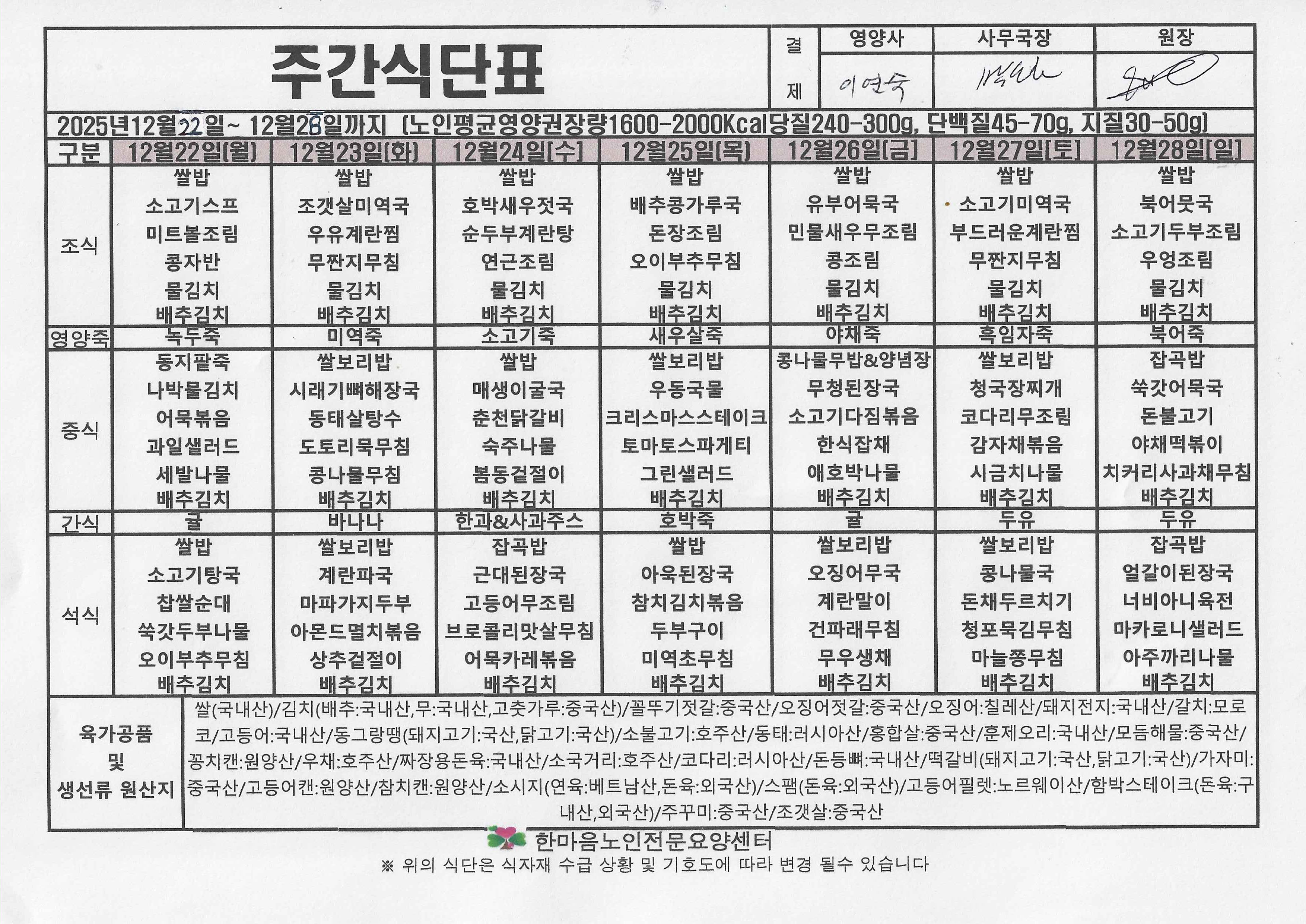 12월 4주 식단표(12.22.~12.28.)