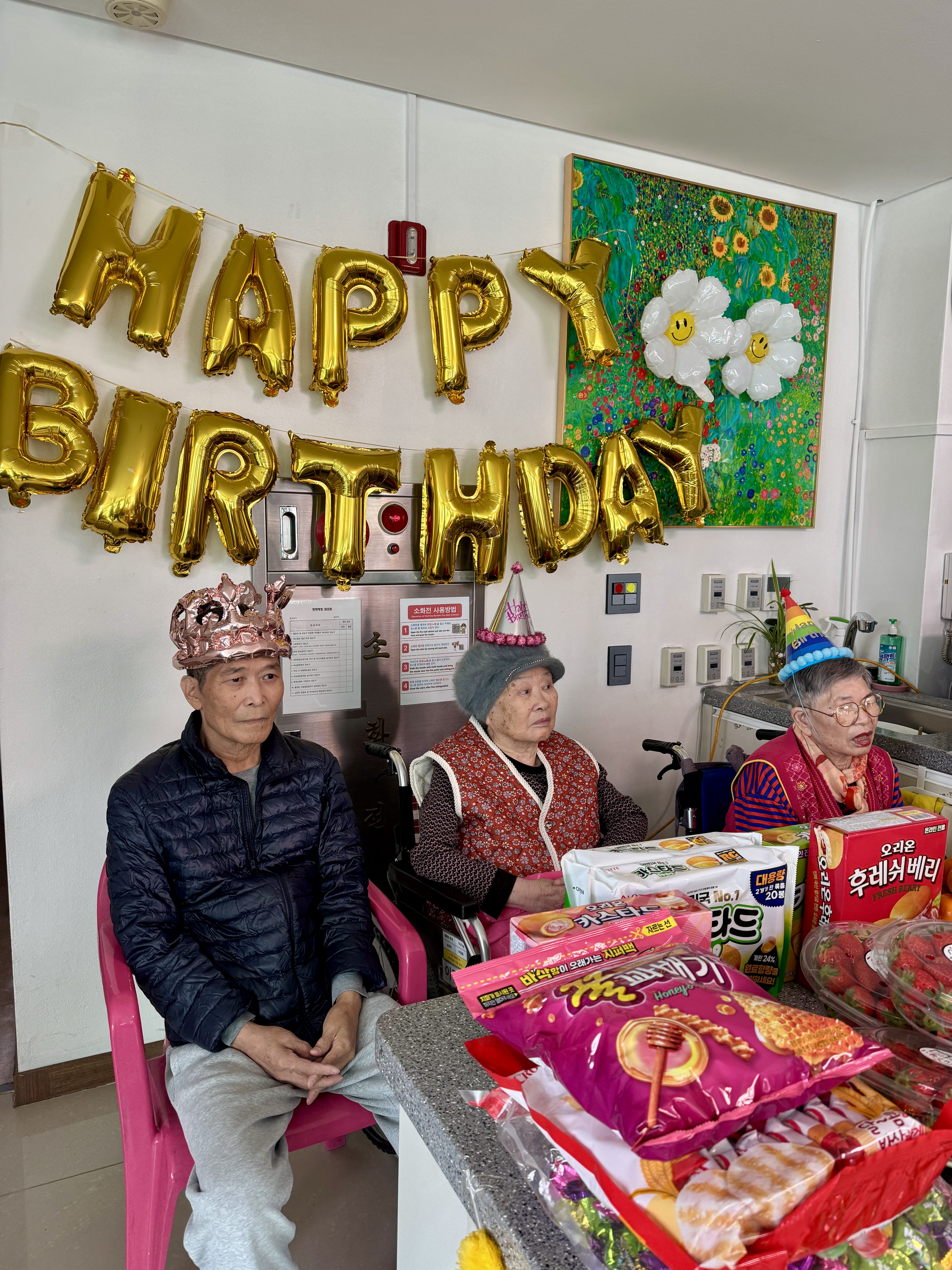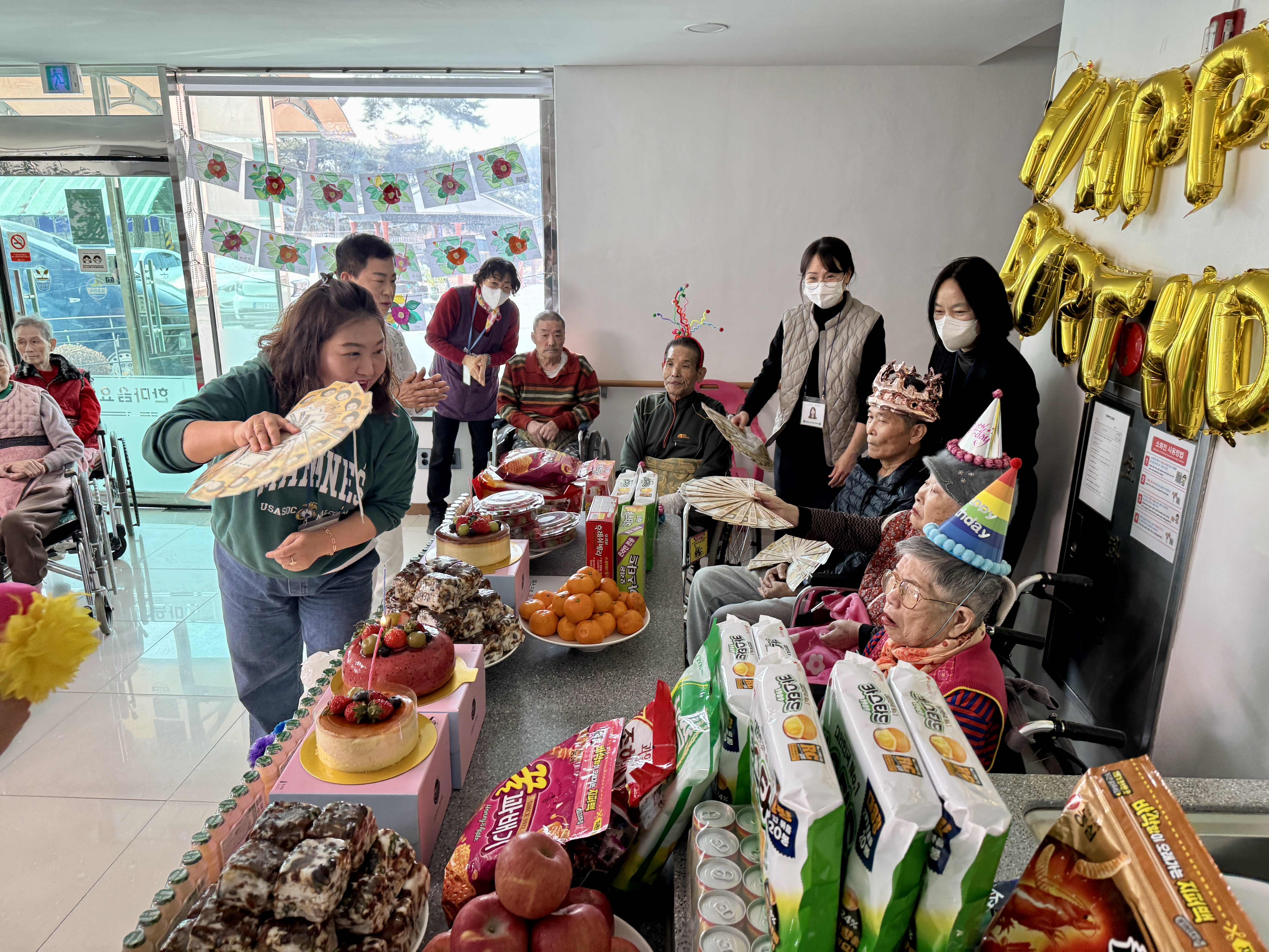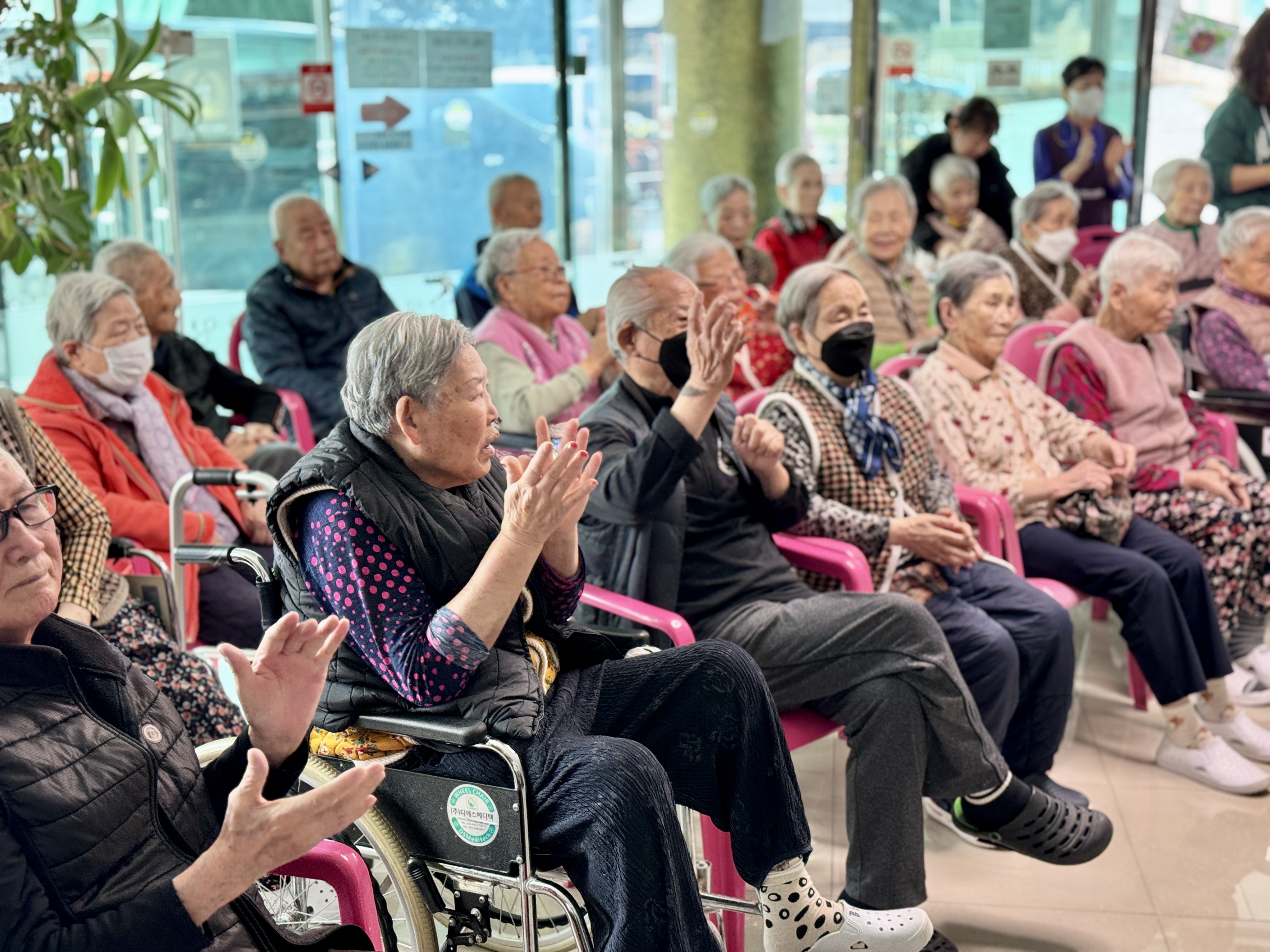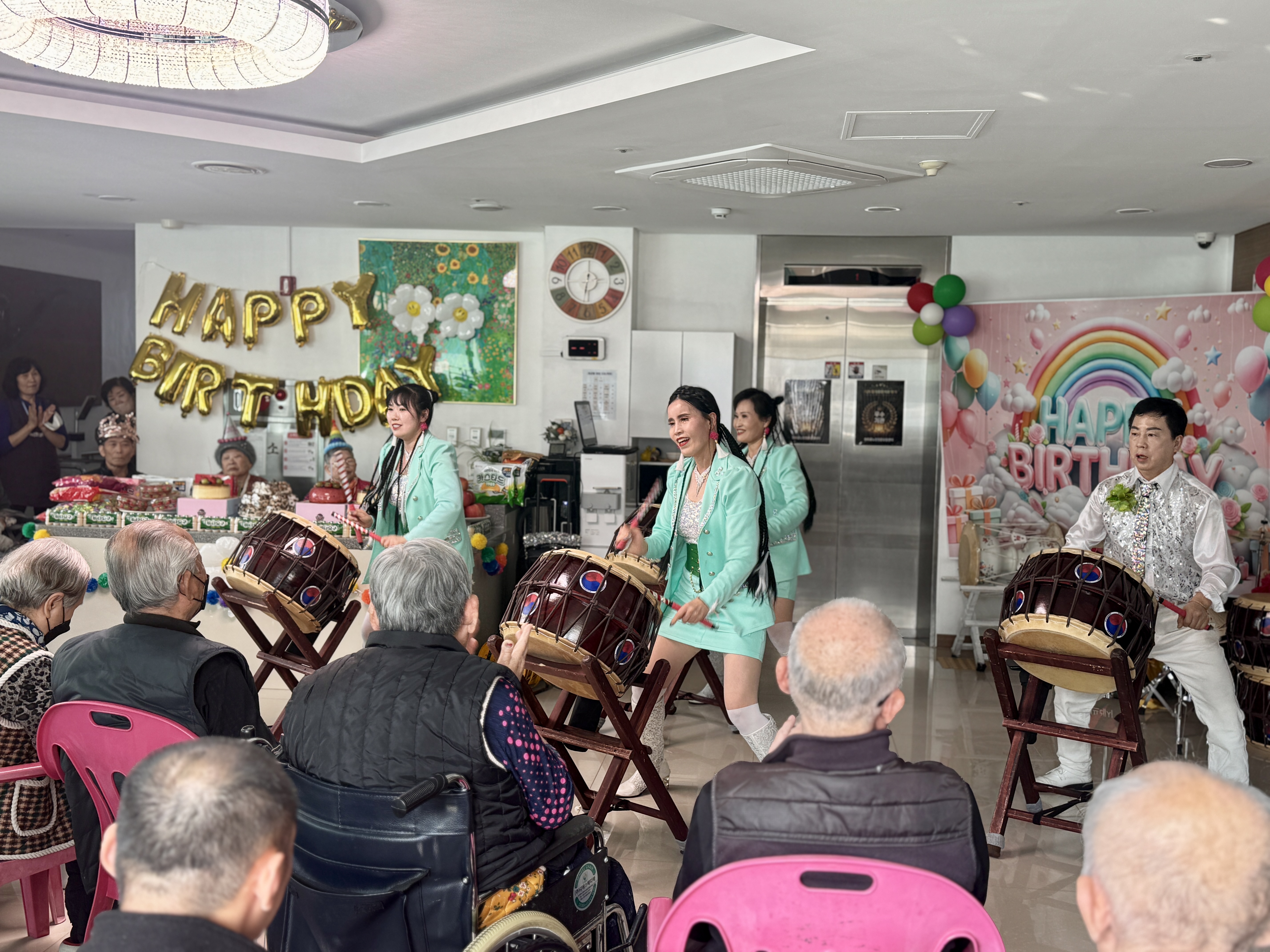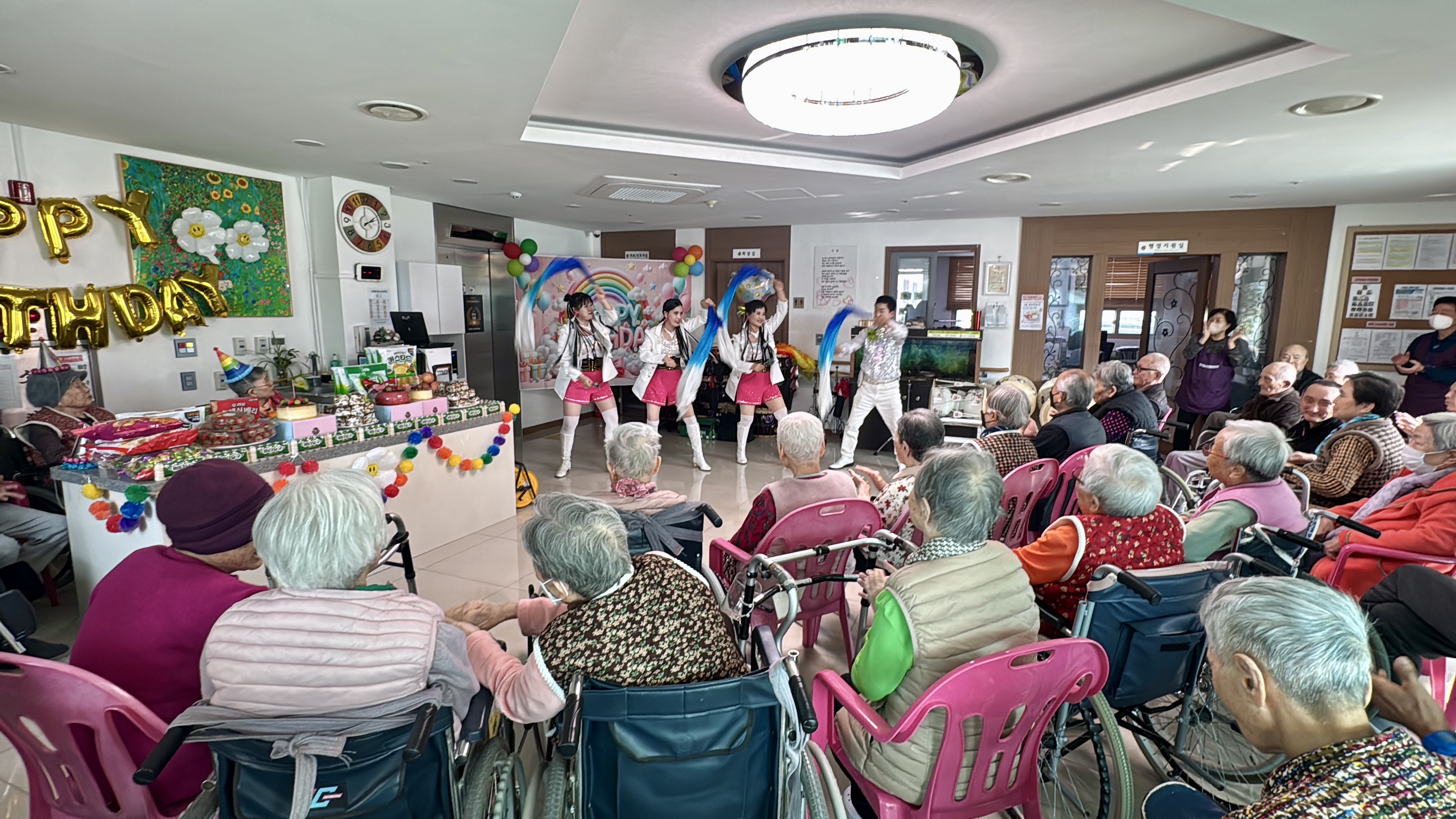 모두들 반짝이는 의상을 입고 온 공연단을 보며 환호해 주시고 호응은 젤 1등이라고 엄지척 해주셨습니다~ 어르신들 이시간 만큼은10대 20대로 돌아가 소리지르며 박수치고 공연단들의 공연을 잘 보셨습니다. 보호자님참여로 오늘은 특별히 더 풍성하고 즐거운 생신잔치가 되었습니다^^