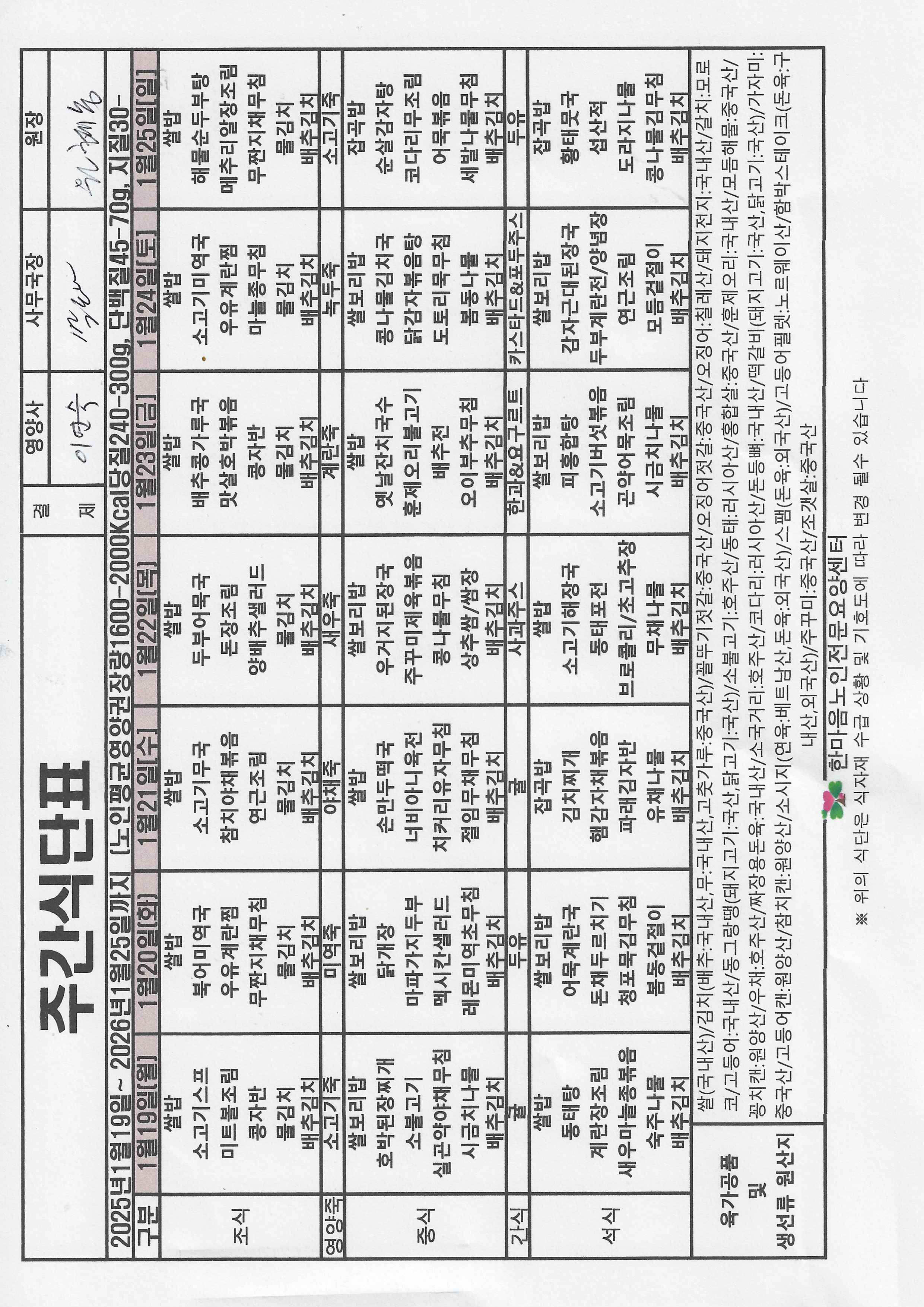 1월 3주 식단표(01.19.~01.25.)