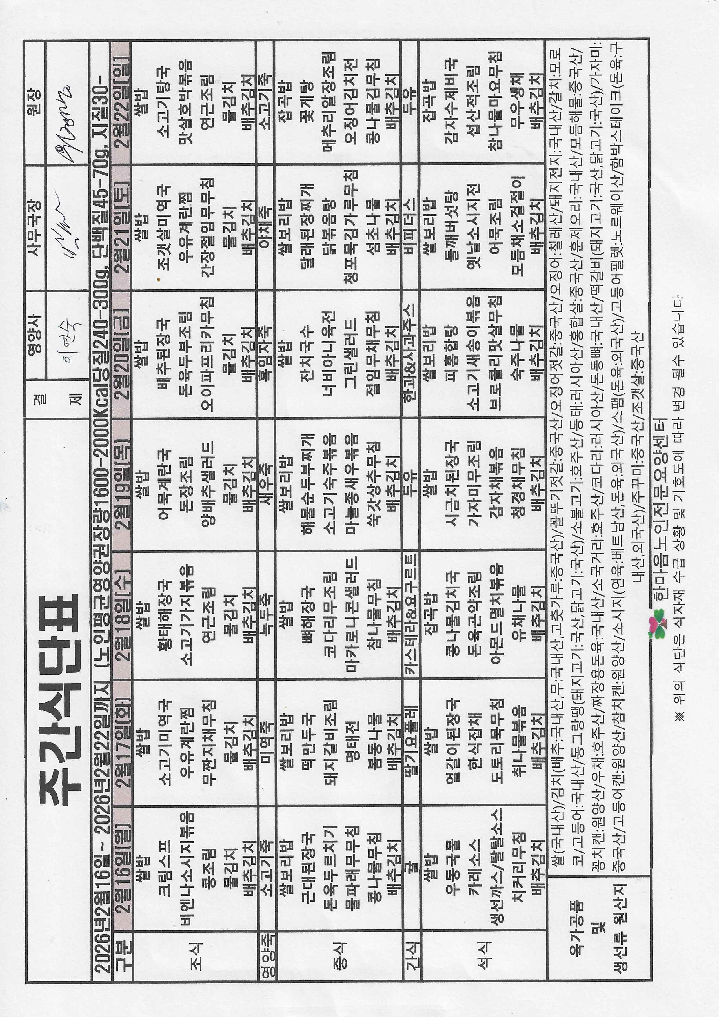 2월 3주 식단표(02.16.~02.22.)